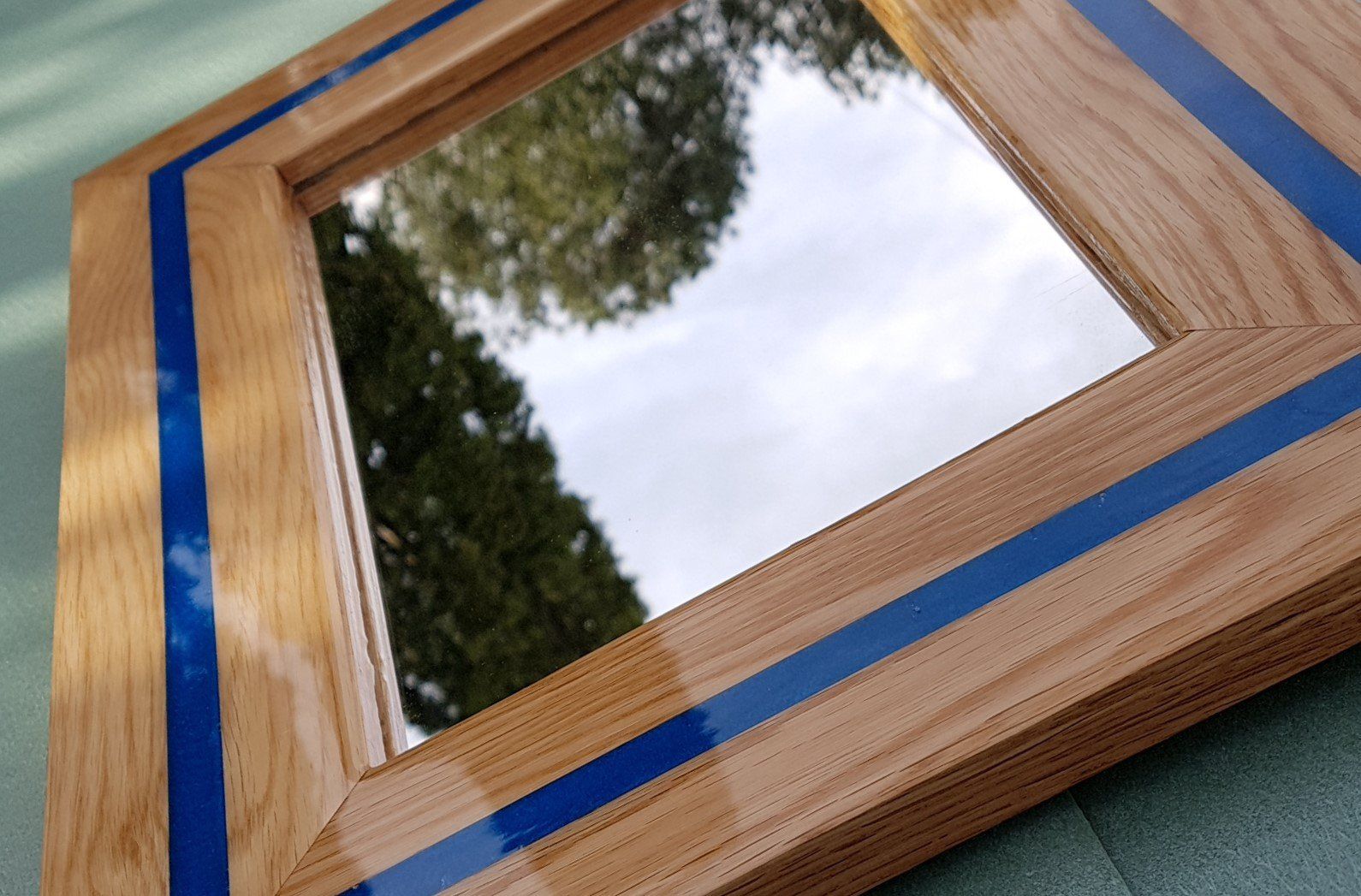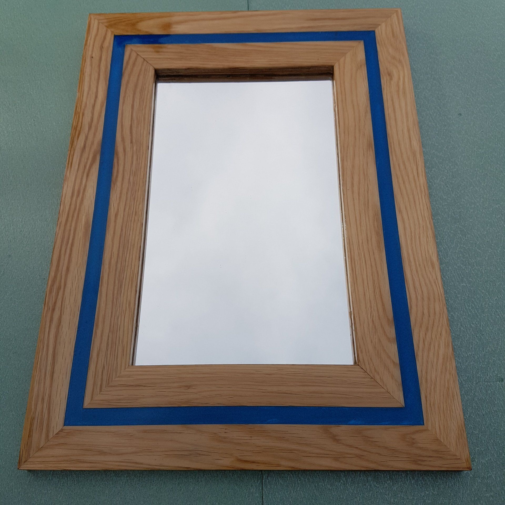 This is a beautiful mirror hand made by myself from recalaimed oak flooring. The joints for the frame are mitres. The frame has been inlayed with electric blue epoxy resin and finished in high gloss crystal clear epoxy resin. The back has been professionally finished.
