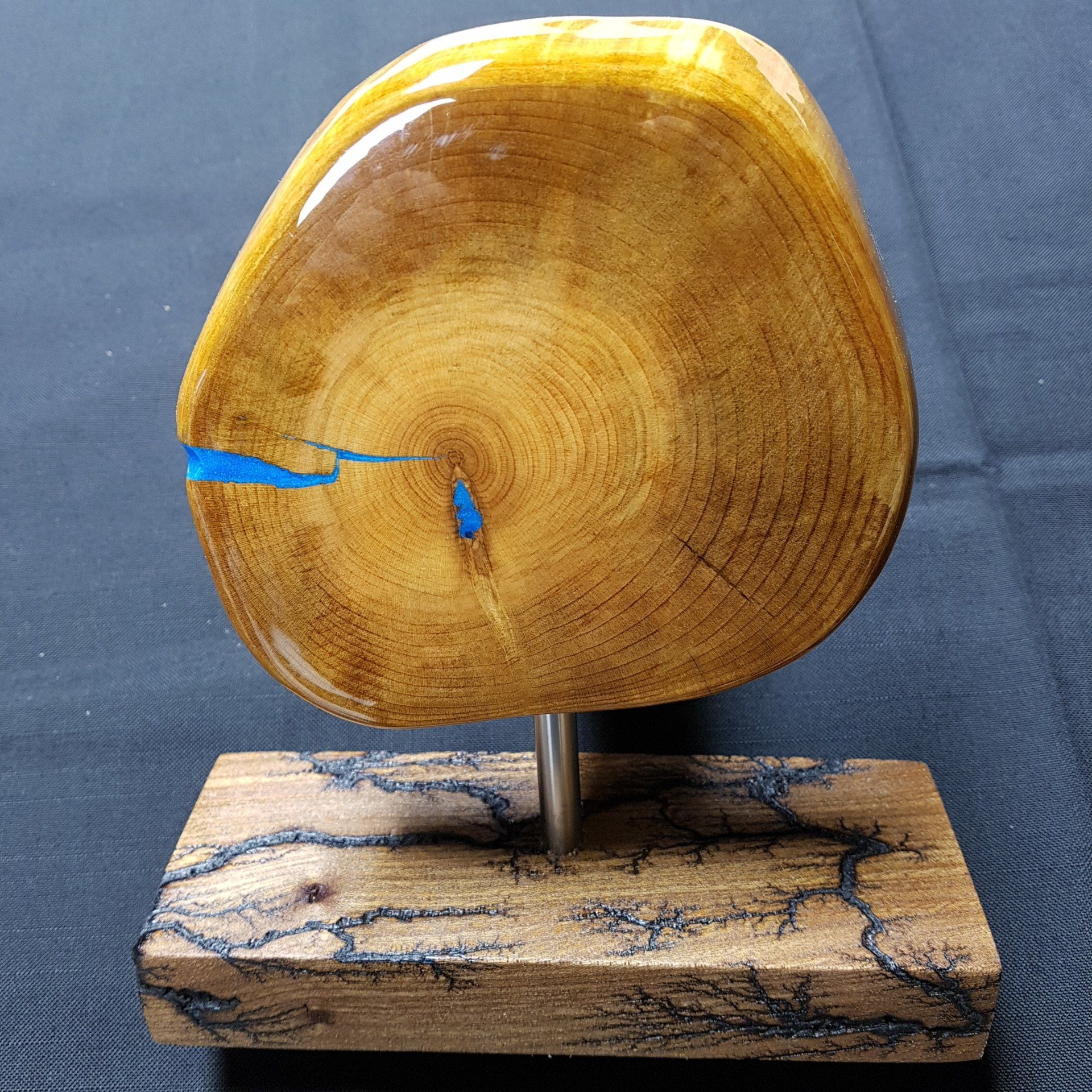 This is a beautiful cherry slice hand made by myself, mounted on an elm plinth with a polished stainless steel rod. The slice has been enhanced with electric blue resin infill within the natural splits of the dried wood. The slice has then been finished in crystal clear epoxy resin giving a high gloss finish. The plinth has been decorated using the lichtenberg fractal burning technique giving the effect of lightning burned into the wood