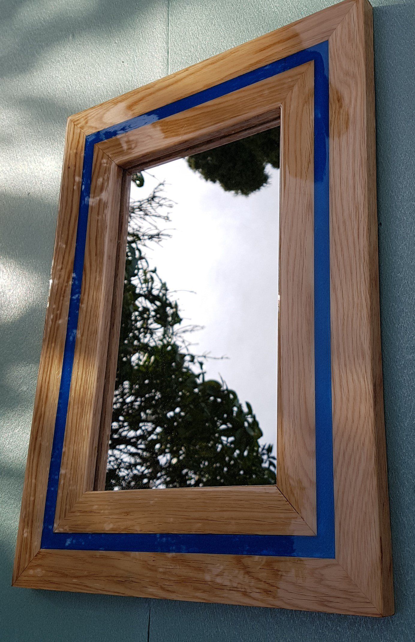 This is a beautiful mirror hand made by myself from recalaimed oak flooring. The joints for the frame are mitres. The frame has been inlayed with electric blue epoxy resin and finished in high gloss crystal clear epoxy resin. The back has been professionally finished.