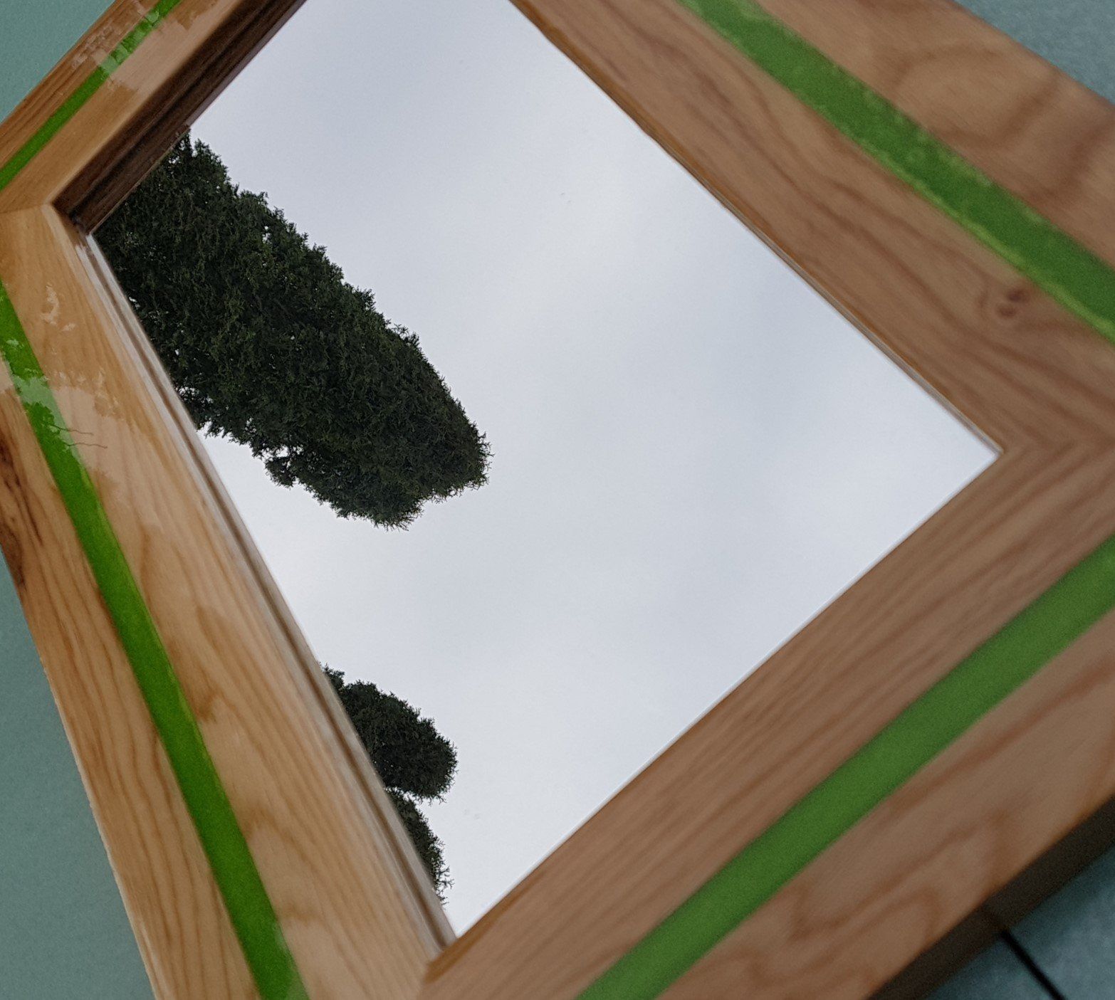 This is a beautiful mirror hand made by myself from reclaimed oak flooring. The joints for the frame are mitres. The frame has been inlayed with pearlescent green epoxy resin and finished in high gloss crystal clear epoxy resin. The back has been professionally finished.